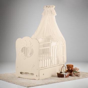 Красивая и удобная кроватка «Птенчики» с поперечным маятником – сон в такой кроватке будет здоровым и безмятежным, а красивые резные аппликации на корпусе будут радовать глаз малыша днем. Оригинальный дизайн кроватки делает ее произведением мебельного искусства. Отделка кроватки выполнена с использованием кристаллов Swarovski.
