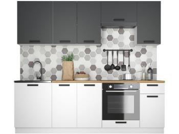 Широкие черные ручки-скобы с бархатистым покрытием Soft-touch не только удобны в использовании, но и придают кухне уникальный стиль и характер. Важно отметить, что гарнитур можно дополнить модулями для вытяжки и духовки, что делает его еще более универсальным. Столешница в комплект не входит. Верхние шкафы имеют высоту 720 мм и включают одну полку без кромки на закрытых торцах. Модуль под мойку не содержит полки и задней стенки, а пластиковый цоколь белого цвета высотой 100 мм завершает образ гарнитура. Этот комплект станет стильным и практичным выбором для вашей кухни, сочетая комфорт и функциональность.