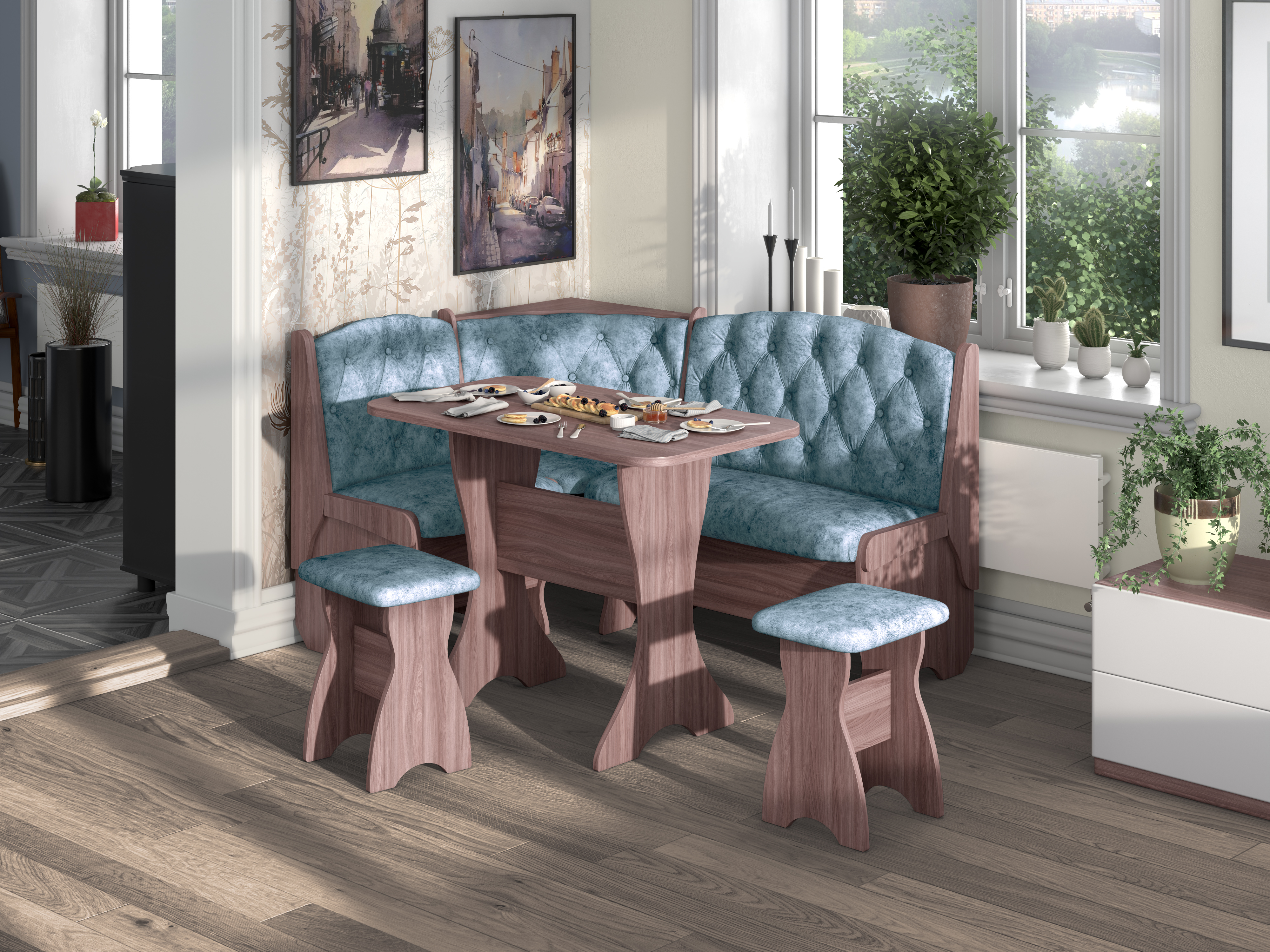 Набор мебели для кухни с классической красивой каретной стяжкой, включающий в себя угловую скамью, стол и два табурета. В угловой скамье под сиденьями расположены два ящика. Каркас ЛДСП. Покрытие верхней части столешницы стола – термостойкий пластик, кромка ПВХ -1мм. Угловая скамья собирается как в правом (“Г”), так и в левом исполнении (“7”). Углы столешницы закруглены для избежание травмирования и придания лучшего эстетического вида. Каркас выполнен из ЛДСП. Обивка мягких частей выполнена с каретной классической стяжкой. Размер угловой скамьи по длине 1500х1100 или 1100х1500 в зависимости от сборки ( “Г” или “7”), высота угловой скамьи 840, глубина угловой скамьи 530.Размер столешницы стола 1000х580, высота стола 750. Размер сиденья табурета 300х380, высота табурета 450.