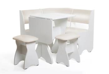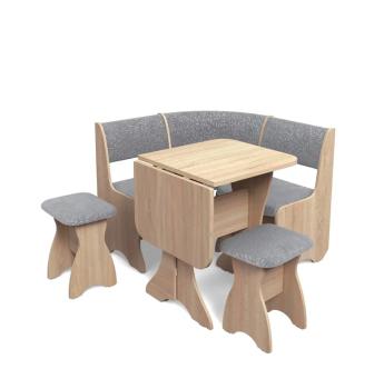 Набор мебели для кухни включающий в себя угловую скамью, стол и два табурета. В угловой скамье под сиденьями расположены два ящика Каркас ЛДСП. Покрытие верхней части столешницы стола – ЛДСП, кромка ПВХ -1мм. В целях безопасности и придания лучшего эстетического вида углы столешницы закруглены. Угловая скамья собирается как в правом (“Г”), так и в левом исполнении (“7”). Современная комбинация цветов обивки и декора. Размер угловой скамьи по длине 1000х1000 вне зависимости от сборки ( “Г” или “7”), высота угловой скамьи 840, глубина угловой скамьи 500. Размер столешницы стола 625х580 в сложенном виде и 1000х580 в разложенном виде, высота стола 750. Размер сиденья табурета 300х380, высота табурета 450.