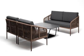 Каркас уличной мебели выполнен из прочного алюминия. Его дополняет коричневая оплетка, изготовленная на основе эластичных синтетических лент из полиэфирных волокон высокой прочности.