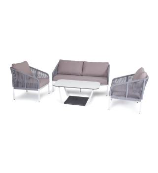 Каркас уличной мебели выполнен из износостойкого алюминия, окрашенного в белый цвет. Его дополняет светло-серая ручная оплетка, изготовленная на основе эластичных синтетических лент из полиэфирных волокон высокой прочности.