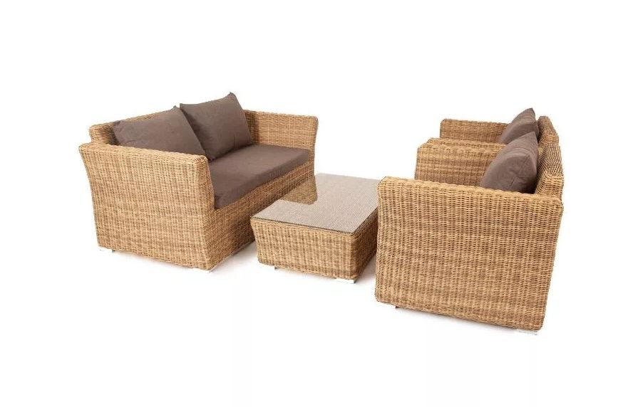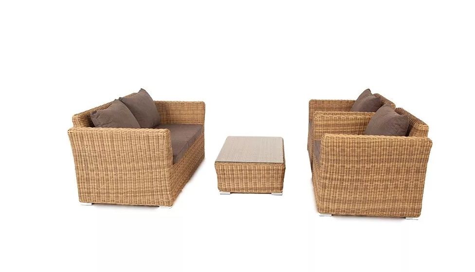 Лаунж зона на 4 персоны. 1 двухместный диван, 2 кресла, журнальный столик со стеклянной столешницей толщиной 5 мм. Искусственный ротанг, круглое плетение, алюминиевый каркас. “Капучино”, диван двухместный, коричневый 1шт. 1 700Х850Х810, “Капучино”, журнальный столик, коричневый 1шт. 1 100Х660Х300, “Капучино”, кресло, коричневый 2шт. 1 050Х850Х810