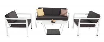 Каркас дивана и кресел выполнен из прочного алюминия и окрашен в белый цвет. Комплект дополняют подушки со съемными чехлами и водоотталкивающей пропиткой. Материал чехлов – 100% полиэстер плотностью 230гр/м2.