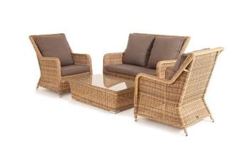 Основа всех изделий изготовлена из алюминия, вся конструкция обвита ручным способом искусственным ротангом соломенного цвета. Кресла и диван оснащены серыми подушками из 100% полиэстера, плотность которого – 230гр/м2. Ткань имеет влагоотталкивающие свойства благодаря специальной пропитке. Поверхность столика покрыта 5 мм закаленным стеклом.