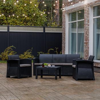 Конструкция выполнена из прочного пластика в элегантном черном цвете. Подушки серого оттенка обиты полиэстером, что обеспечивает их долговечность. Наполнение подушек — пенополеуретан, предлагающий высокий уровень комфорта во время отдыха.