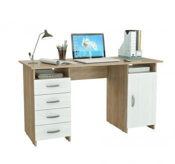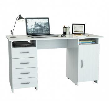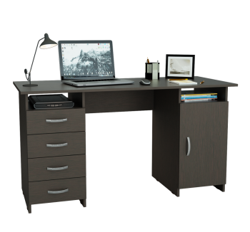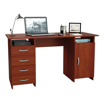 Стол с 5 выдвижными ящиками и тумбой. Стол изготовлен из ламинированной ДСП толщиной 16 мм, обработанной кромкой ПВХ толщиной 2 мм. Фасады ящиков утоплены в корпус тумбы. Используются пластиковые ручки, а также пластиковые подпятники для защиты поверхности пола от повреждений.