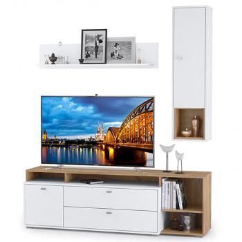Гостиная Бэль № 02 от бренда Mobi – это современный модульный набор мебели, который идеально подойдет для небольших помещений. Комплект включает тумбу, полку и навесной шкаф, выполненные в элегантном цвете "дуб крафт золотой/белый премиум". Сочетание вертикальных и горизонтальных линий создает эффект динамики, а натуральные оттенки придают интерьеру теплоту и уют.