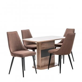 Обеденная зона для ежедневного приёма пищи, а на случай гостей – легко и быстро разложив, за ним может с комфортом разместиться до 6 человек. Стол с центральной опорой, облегчающей доступ с любой из сторон. Декоративная вставка на опоре, делает стол уникальным и запоминающимся. Стулья на устойчивом металлическом каркасе. Благодаря высокой спинке с легкими изгибами в области шеи и поясницы и мягкому сиденью можно расслабиться и отдохнуть. Ножки стула оснащены пластиковыми заглушками, предохраняющими напольное покрытие от повреждений. Обивка у стульев из прочного велюра, который обладает высокими потребительскими и эксплуатационными свойствами.