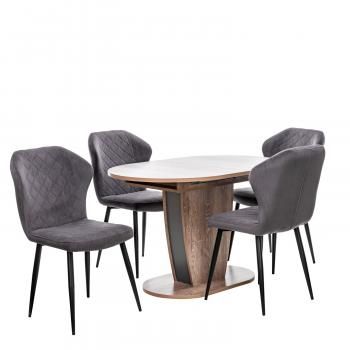 Прекрасное функциональное решение для классических кухонь и гостиных. Скругленные углы стола дают больше простора для маневров. В разложенном виде вмещает до 6-8 человек и является отличным решением для квартир небольших площадей. Дополнительная вставка в цвет стола компактно сложена в подстолье и формирует целостный образ изделия. Широкая спинка стульев имеет боковые отступы, похожие на крылья: такая форма обеспечивает особый комфорт посадки. Для придания дополнительного комфорта, каркас наполнен специальным наполнителем, что делает отдых еще более комфортным. Прямые ножки имеют форму в виде перевернутого конуса, это делает стул более устойчивым. А наконечники на ножках стульев защищают поверхность пола от нежелательных повреждений.