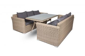 Обеденная группа Мокко Дабл из искусственного ротанга: 2 трехместных дивана и обеденный стол со стеклянной столешницей. Алюминиевый каркас, искусственный ротанг, круглое плетение,съемные чехлы серого цвета, ручная работа. “Капучино” диван трехместный, соломенный 2шт. 2 200Х850Х810, “Латте”, стол, соломенный 2000х900 1шт. 2 000Х900Х750