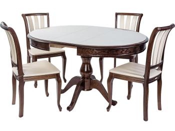 Столешница из МДФ дополнена натуральным дубовым шпоном, что придает изделию элегантный вид. Стулья имеют прочный каркас из массива березы, обработанный комбинированной эмалью, что обеспечивает их надежность.