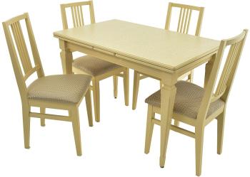 Стулья также изготовлены из массива березы и обработаны водоэмульсионной эмалью, что обеспечивает долговечность и защиту. Резная отделка опоры стола добавляет изысканности, а гармоничное сочетание цветов подчеркивает текстуру древесины.