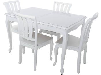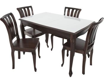 Стол «Кабриоль Glass» выполнен в крашении Тон 9 (эмаль белая) и имеет столешницу из МДФ, облицованную натуральным дубовым шпоном. Стулья изготовлены из массива березы, что обеспечивает прочность и долговечность. Водоэмульсионная эмаль на каркасах стульев придает им современный вид.