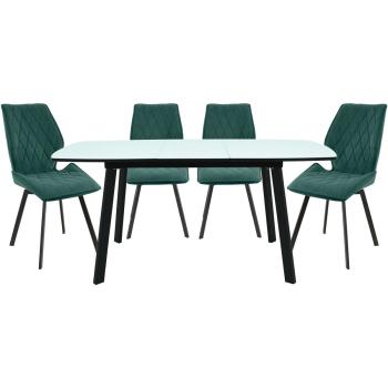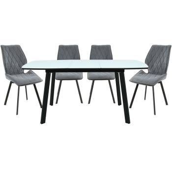 Обеденная группа «ДМФ Аврора» включает в себя стол «Валенсия» и четыре стула «Амаретто». Стол выполнен в черном цвете и оснащен белой стеклянной поверхностью Опти, что придает ему современный и стильный вид. Стулья имеют вращающиеся каркасные конструкции, обтянутые тканью Бренди мансун, что обеспечивает комфорт и элегантность.