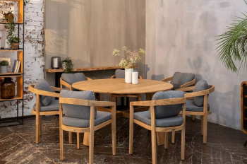 Эффектное сочетание натуральной фактуры массива тика и стильных светло-серых подушек у обеденных кресел.