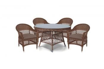 Каркас стола изготовлено из алюминия, благодаря чему его легко перемещать. Металл оплетен синтетическим ротангом круглого ручного плетения насыщенного шоколадного оттенка. Столешница – стекло, устойчивое к механическим повреждениям и высоким температурам.