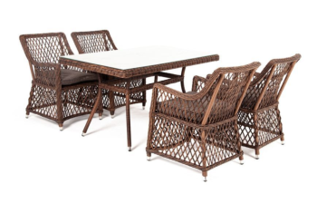 Ротанговая обеденная группа «Латте» со стульями из коллекции «Сицилия». Набор состоит из прямоугольного стола со стеклянной столешницей, размером 1400х900х750 мм и 4 кресел, размером – 590×640×820 мм. Комплект гармонично сочетает в себе алюминий, из которого выполнен каркас и декор из искусственного ротанга насыщенного шоколадного оттенка. Прекрасным дополнением мебели стали мягкие подушки из всепогодной ткани со съемными чехлами. Вы можете приобрести каждый из элементов набора отдельно, чтобы оборудовать лаунж-зону нужного вам размера. “Латте” плетеный стол из искусственного ротанга 140х80см, цвет коричневый 1шт. 1 400Х800Х750, “Сицилия” плетеный стул из искусственного ротанга, цвет коричневый 4шт. 590Х640Х820,