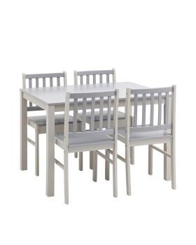 Стулья и ножки стола выполнены из массива дерева гевеи, которое отличается высокой влагостойкостью, устойчивостью к изменениям температур и прочностью. Цвет стульев и стола – белый с серыми деталями, классический вариант для любой современной кухни.