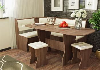 Ничто не дарит такого уюта кухне, как красивый кухонный угол. Среди мебели эконом класса прекрасным вариантом станет кухонный гарнитур Жасмин. Он выполнен в теплых оттенках светло-коричневого в сочетании с молочным цветом. В комплект входит удобный угловой диванчик, два табурета и компактный, но довольно вместительный стол овальной формы (сложенный и разложенный вариант использования стола). Табуреты и диван имеют мягкую и удобную обивку. Такой вариант подходит как для большой семьи, так и для людей, любящих принимать много гостей. Кухонный угол Жасмин станет любимым местом сбора всей семьи и друзей.
