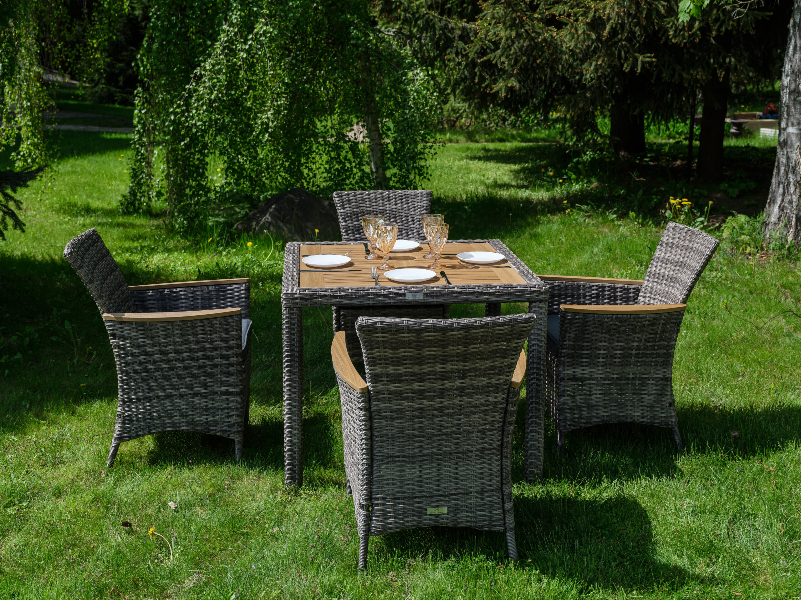 Обеденный комплект AMELIA на 4 персоны — это идеальное решение для тех, кто ценит комфорт, стиль и долговечность в интерьере. Комплект включает 4 кресла и квадратный стол, выполненные в элегантном стиле, подходящем как для уличного, так и для внутреннего использования.