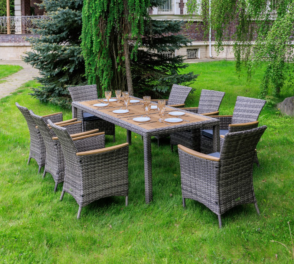 Обеденный комплект AMELIA — это идеальное решение для тех, кто ищет стиль, комфорт и надёжность в интерьере. Комплект включает в себя стол 200×90×75 см и восемь кресел по 60×60×88 см, что позволяет разместить до 8 человек. Универсальный оттенок делает его подходящим как для загородного дома, так и для дачи или террасы.