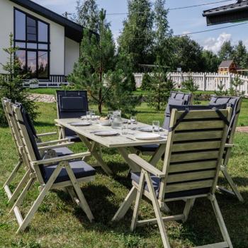 Обеденный стол размером 190х85х74 см выполнен из акации, что обеспечивает прочность и долговечность. Кресла, которые тоже сделаны из этого материала, обладают размерами 49х62х108 см и обеспечивают комфорт благодаря качественным подушкам. Чехлы на подушках выполнены из водоотталкивающего материала Olefin, что делает их идеальными для использования на открытом воздухе.