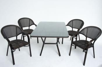 Изготовлен из качественного и надежного ротанга, а большая столешница из прочного стекла.