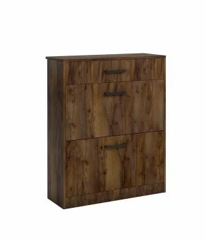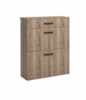 Компактная обувница с двумя откидными секциями и одним выдвижным ящиком. Выдвижной ящик на шариковых направляющих. Изготавливается обувница из материалов высокого качества: ЛДСП 16 мм, кромка ПВХ 0,45 мм.