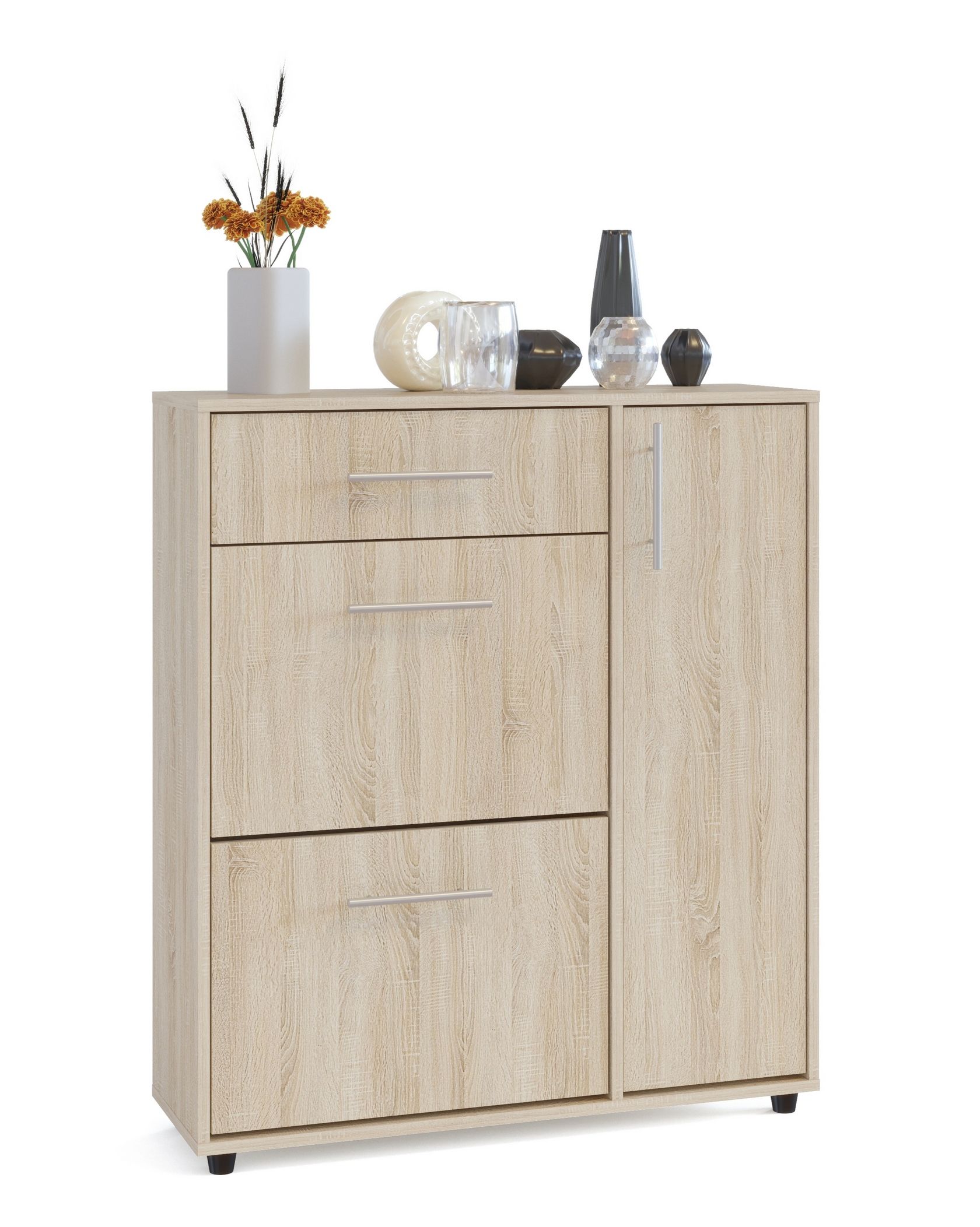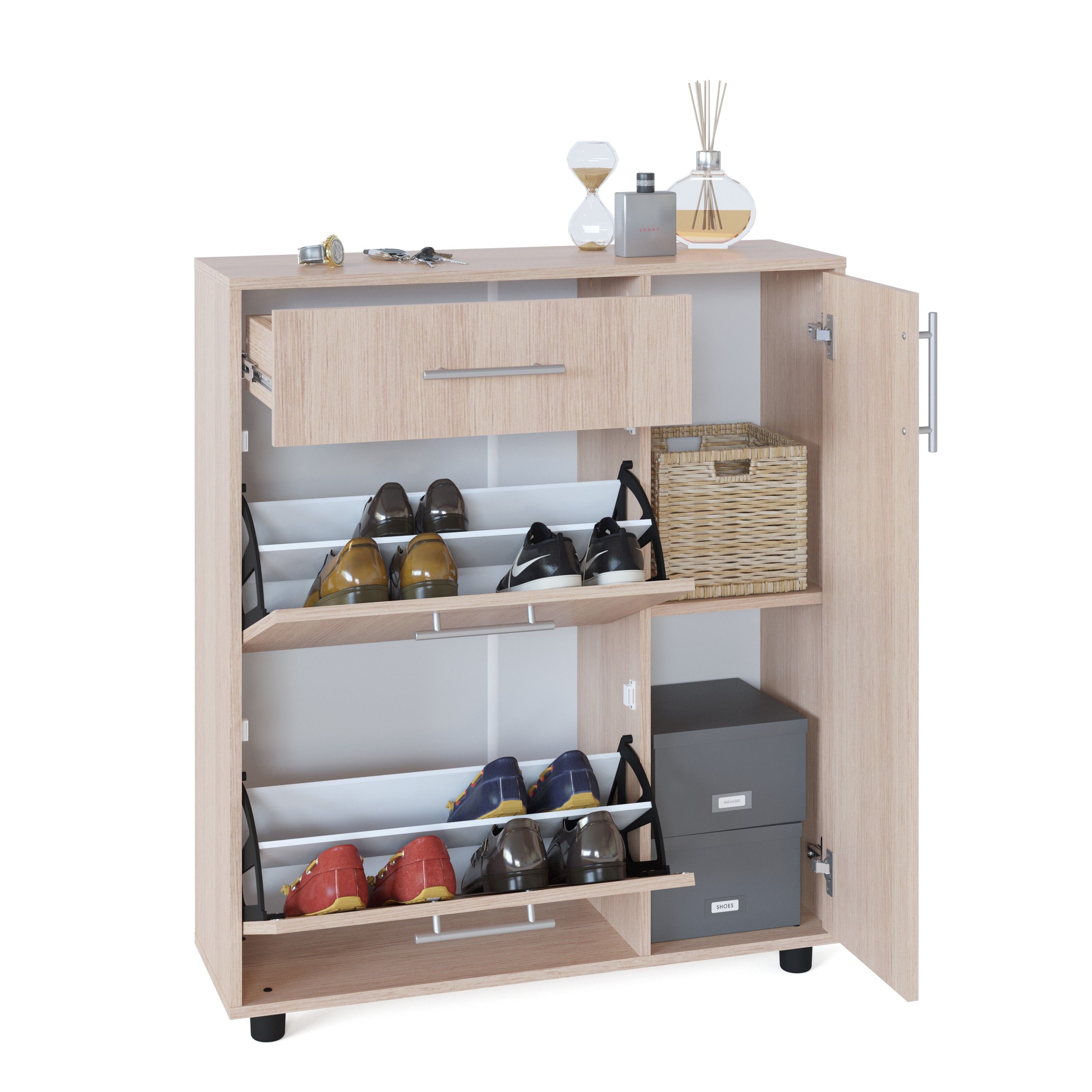 Вместительная тумба для обуви оборудована выдвижным ящиком, двумя отсеками для обуви и полками за дверцей.
