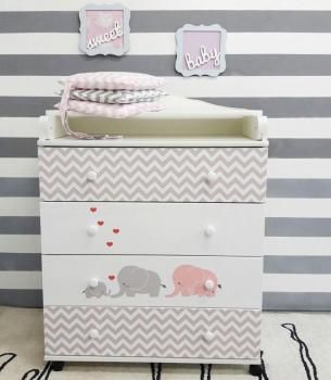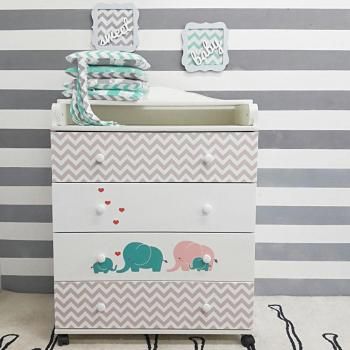 Компактный пеленальный комод “Мэри” оснащен 4 вместительными ящиками с шариковыми направляющими. Корпус выполнен из ламинированной древесно-стружечной плиты (ЛДСП), фасады ящиков из МДФ.