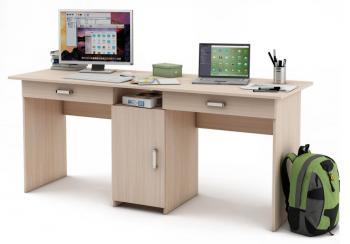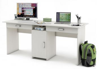 Письменный стол МФ Владимир Лайт-10Я – имеет просторную столешницу разделену на два полноценных рабочих места. Для большего удобства под каждым рабочим местом есть выдвижной ящик, для хранения мелких вещей. Внизу, посередине есть шкафчик, который закрывается дверкой. Над шкафчиком расположилась дополнительная полочка открытого типа. Это красивая функциональная мебель, которая отлично дополнит любое интерьерное решение. Подобная модель станет хорошим дополнением к рабочему кабинету. Стол достаточно просторный, но при этом не занимает много места. Также с помощью такого стола можно обустроить детям или подросткам, отличное место для учебы.