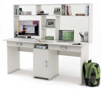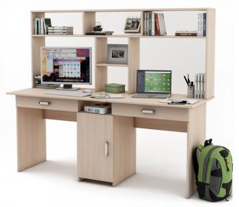 Письменный стол МФ Владимир Лайт-10Я с надстройкой – предусматривает просторную столешницу разделену на два полноценных рабочих места, с двумя выдвижными ящиками, под каждой рабочей поверхностью. Также здесь есть многофункциональная надстройка с несколькими полками открытого типа. Внизу, посередине есть шкафчик, который закрывается дверкой. Над шкафчиком расположилась дополнительная полочка открытого типа. Это красивая функциональная мебель, которая отлично дополнит любое интерьерное решение. Подобная модель станет хорошим дополнением к рабочему кабинету. Стол достаточно просторный, но при этом не занимает много места. Также с помощью такого стола можно обустроить детям или подросткам, отличное место для учебы.