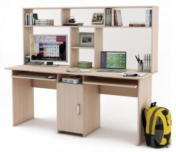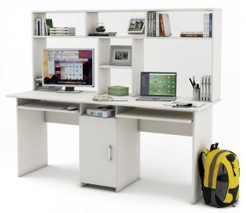 Письменный стол МФ Владимир Лайт-10К с надстройкой – предусматривает просторную столешницу разделену на два полноценных рабочих места, с двумя выдвижными полками для клавиатуры. Также здесь есть многофункциональная надстройка с несколькими полками открытого типа. Внизу, посередине есть шкафчик, который закрывается дверкой. Над шкафчиком расположилась дополнительная полочка открытого типа. Это красивая функциональная мебель, которая отлично дополнит любое интерьерное решение. Подобная модель станет хорошим дополнением к рабочему кабинету. Стол достаточно просторный, но при этом не занимает много места. Также с помощью такого стола можно обустроить детям или подросткам, отличное место для учебы.