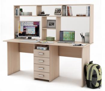 Письменный стол МФ Владимир Лайт-11 с надстройкой – предусматривает просторную столешницу разделену на два полноценных рабочих места. Конструкция предусматривает просторную надстройку разделену на шесть полок открытого типа. Внизу, посередине есть четыре выдвижных ящика. Над ними расположилась дополнительная полочка открытого типа. Это красивая функциональная мебель, которая отлично дополнит любое интерьерное решение. Подобная модель станет хорошим дополнением к рабочему кабинету. Стол достаточно просторный, но при этом не занимает много места. Также с помощью такого стола можно обустроить детям или подросткам, отличное место для учебы.