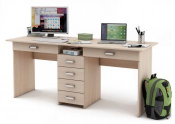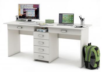 Письменный стол МФ Владимир Лайт-11Я – предусматривает просторную столешницу разделену на два полноценных рабочих места с двумя выдвижными ящиками под каждой из рабочих поверхностей. Внизу, посередине есть четыре выдвижных ящика. Над ними расположилась дополнительная полочка открытого типа. Это красивая функциональная мебель, которая отлично дополнит любое интерьерное решение. Подобная модель станет хорошим дополнением к рабочему кабинету. Стол достаточно просторный, но при этом не занимает много места. Также с помощью такого стола можно обустроить детям или подросткам, отличное место для учебы.