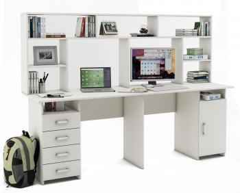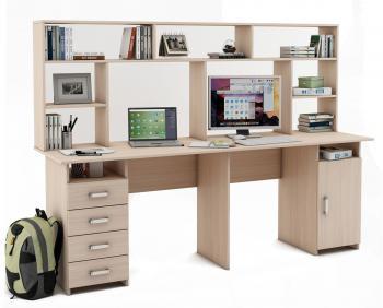 Письменный стол МФ Владимир Лайт-14 с надстройкой – предусматривает просторную столешницу разделену на два полноценных рабочих места и огромною надстройку с шестью открытыми нишами. По бокам разместились отдельный шкафчик, что закрывается дверкой, а с другой стороны четыре выдвижных ящика. Это красивая функциональная мебель, которая отлично дополнит любое интерьерное решение. Подобная модель станет хорошим дополнением к рабочему кабинету. Стол достаточно просторный, но при этом не занимает много места. Также с помощью такого стола можно обустроить детям или подросткам, отличное место для учебы.