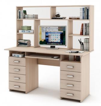 Письменный стол МФ Владимир Лайт-9К с надстройкой – имеет выдвижную полку для клавиатуры и восемь выдвижных ящиков, по четыре с каждой стороны стола. Также данная модель стола обустроена большой надстройкой, которая разделена на шесть отдельных полок открытого типа. Мебель можно приобрести в нескольких цветовых вариантах. Это красивая функциональная мебель, которая отлично дополнит любое интерьерное решение. Подобная модель станет хорошим дополнением к рабочему кабинету. Стол достаточно просторный, но при этом не занимает много места. Также с помощью такого стола можно обустроить детям или подросткам, отличное место для учебы.