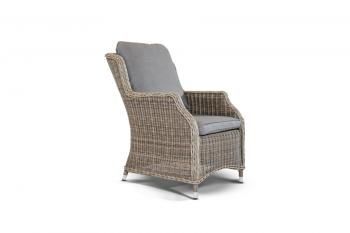 Спинка и подлокотники имеют планые линии, благодаря своим закругленным формам. Каркас мебели сделан из алюминия. Присутствует ручное круглое плетение, при изготовлении которого используется искусственный ротанг. Представлено в серо-соломенном цвете.
