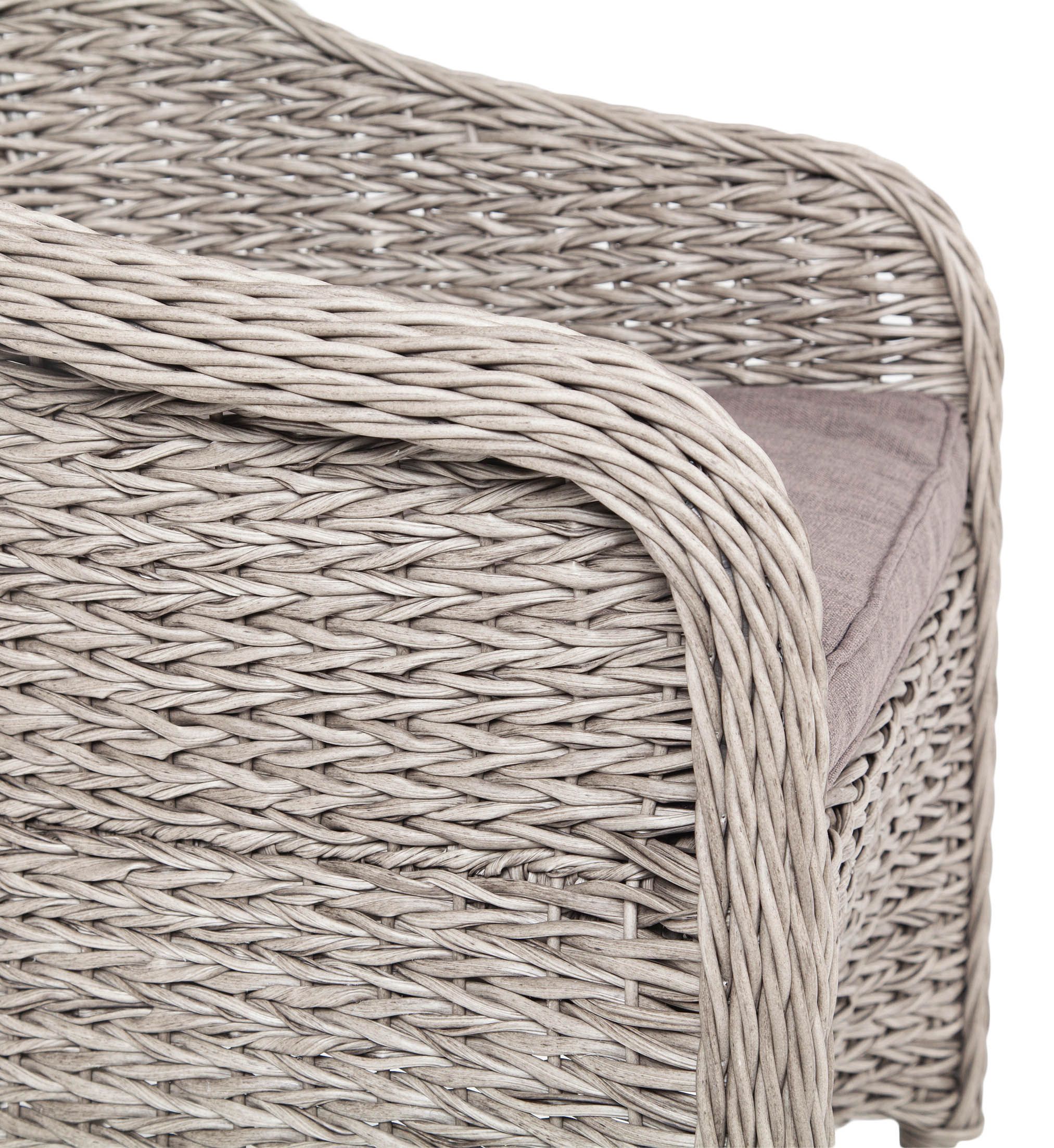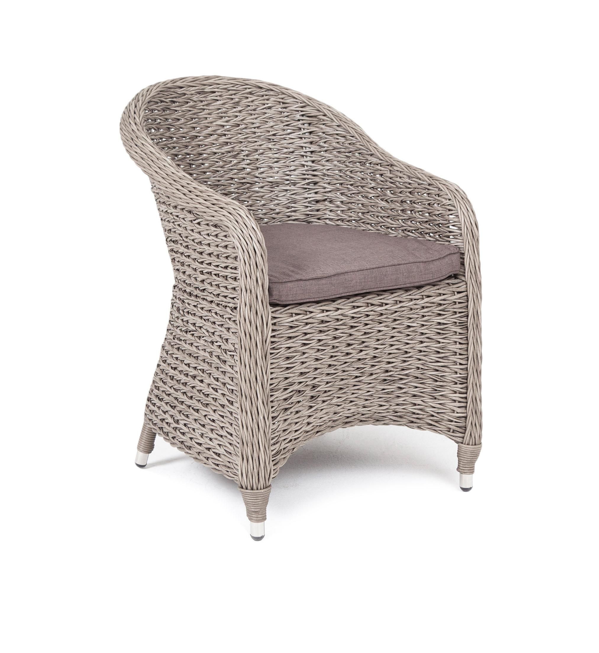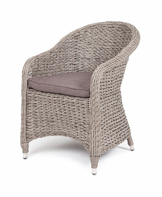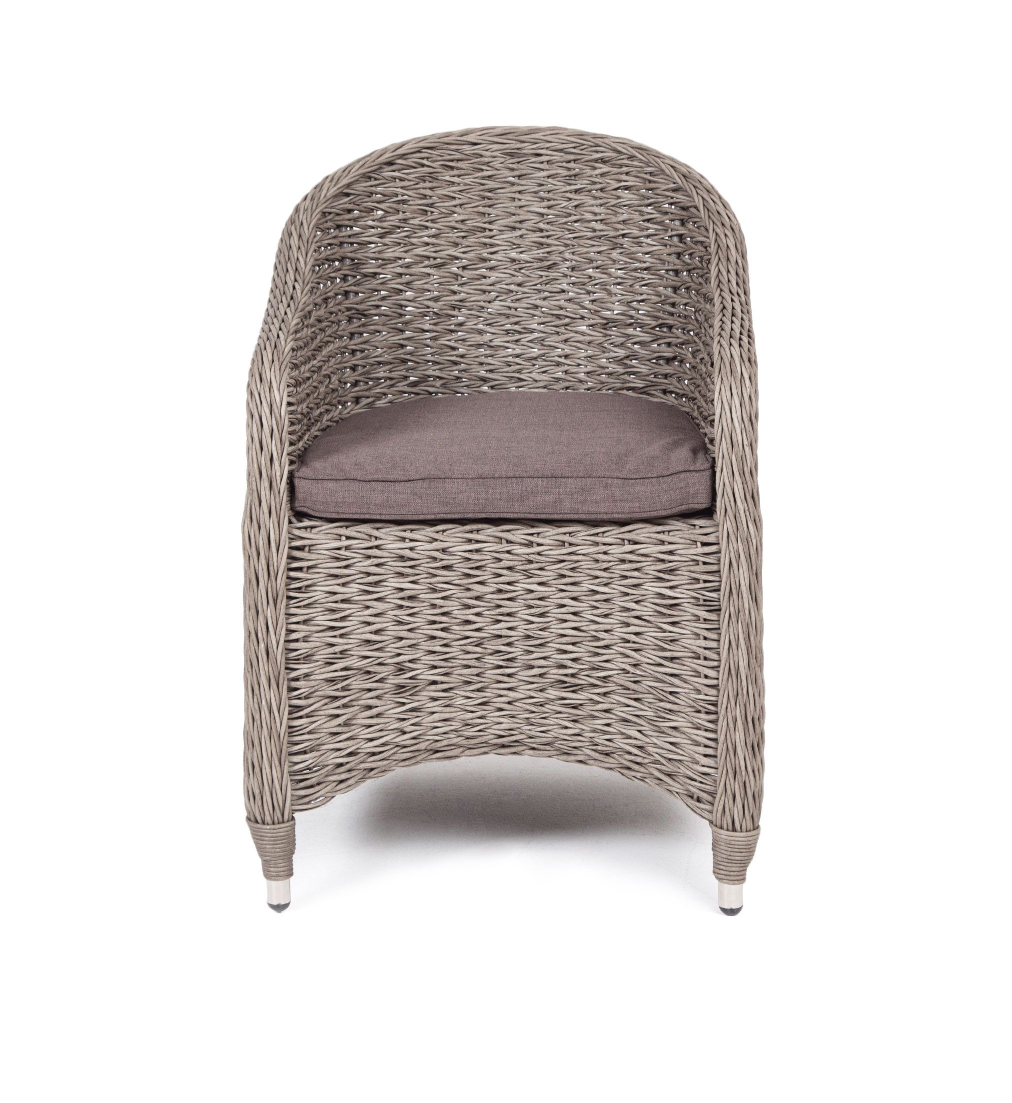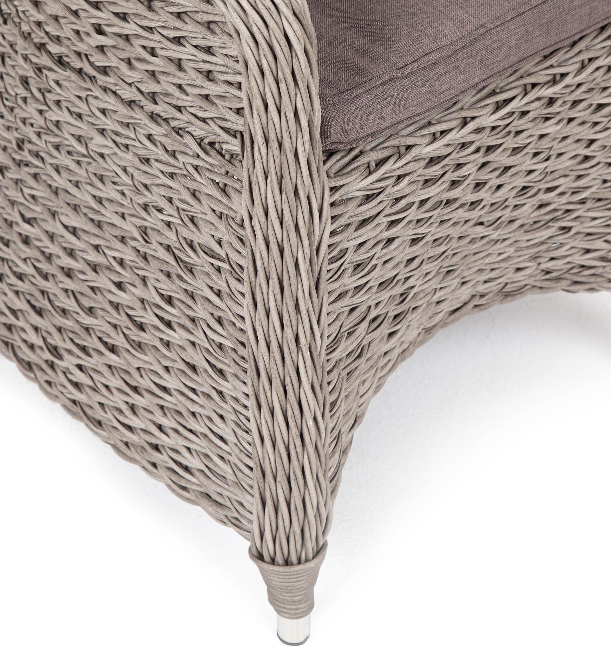 Кресло из искусственного ротанга “Равенна” с плетением вида “гиацинт” обладает крепким алюминиевым каркасом, который вручную обвит ротангом серого оттенка.
