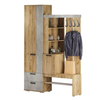 Прихожая BTS Трамп в цветовой гамме «крафт/бетон» станет отличным решением для современного интерьера, особенно в стиле лофт. Изготовленная из качественного ЛДСП, она сочетает два актуальных оттенка: «крафт» и «бетон».