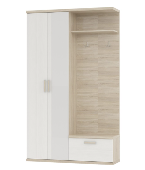Небольшая прихожая с вешалкой, отделением для хранения обуви и шкафом для одежды за распашными дверями одна из которых оборудована зеркалом. Двери универсальны в сборке, зеркальную дверь можно установить как справа так и слева. В шкафу размещены полки и выдвижная штанга.