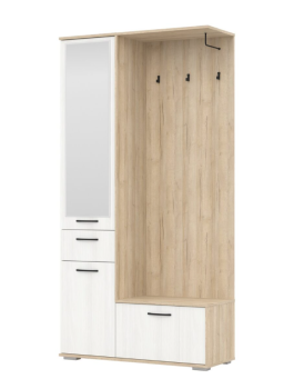 Компактная прихожая с вешалкой, отделением для хранения обуви и полками за распашными дверцами одна из которых оборудована зеркалом. Также имеется выдвижной ящичек для мелочей.