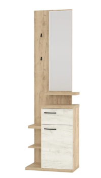 Мини прихожая с открытой вешалкой, зеркалом и тумбой с выдвижным ящиком.