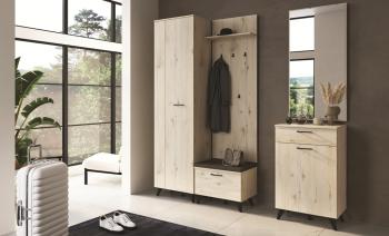 Ищете компактную мебель, которая идеально впишется в современный интерьер Вашей малогабаритной прихожей? Обратите внимание на новинку этого месяца – коллекцию Sofia. Мебель выполнена в трендовом декоре с эко-мотивами “гаскон пайн светлый”, который украшен стильной наружной фурнитурой черного цвета. Разнообразие модулей позволит Вам с комфортом обустроить входную зону в квартире и сэкономить пространство без потери функциональности. Комплект состоит из шкафа для одежды со штангой, тумбы с мягким сиденьем, открытой вешалки, тумбы-обувницы и навесного зеркала.