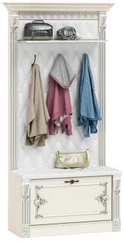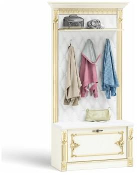 Очаровательная мебель, выполненная в ярком дворцовом стиле, оформит интерьер прихожей с волнующим великолепием и исключительным комфортом. Блеск золота на филигранных резных элементах мебели, благородный цвет, каретная стяжка обивки, металлические элементы вида состаренной бронзы относят нас ко временам прекрасных дам и галантных кавалеров. Достойная самых высоких стандартов прихожая Визит доставит Вам эстетическое удовольствие и подчеркнёт сказочный статус дома. В тон к исключительному дизайну мебели идет и идеальная комплектация и превосходное качество исполнения прихожей. Данная модель прихожей располагает комфортной обувницей с мягким сиденьем для комфортного переобувания и вместительной нишей с одной полочкой за откидной дверкой. Задняя панель в сочетании с мягким сиденьем оббита искусственной кожей затянутой методом каретной стяжки, и имеет три двухрожковых крючка для верхней одежды и антресольную полочку для головных уборов. Прихожую венчает фактурный карниз, который в сочетании с пилястрами на пристеночной панели и тумбе, соединяет прихожую в единую привлекательную и выразительную конструкцию.