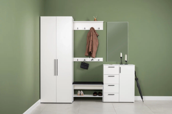 Прихожая Эйр комплектация 1 — это готовое и продуманное решение для организации пространства в современном стиле. Модель выполнена в минималистичном дизайне с белым покрытием, что делает её универсальной для любого интерьера. В комплект входят шкаф, комод, тумба под обувь, зеркало и две вешалки, что обеспечивает удобное хранение и функциональность.