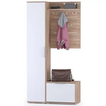 Этот гарнитур сочетает в себе современный дизайн и практичность. Обувница с откидным фасадом удобна для хранения сезонной обуви и может использоваться как банкетка. Вешалка с пятью крючками и полкой поможет организовать хранение верхней одежды и аксессуаров. Пенал с пятью полками за распашной дверцей дополняет систему хранения.