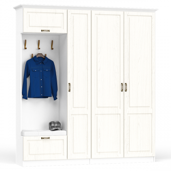 Открытая вешалка с крючками предназначена для повседневной одежды и аксессуаров. Антресоль с откидным фасадом удобна для хранения головных уборов. Выдвижной ящик с мягкой крышкой служит одновременно обувницей и банкеткой. Распашной шкаф-пенал с четырьмя полками обеспечивает дополнительное место для вещей.