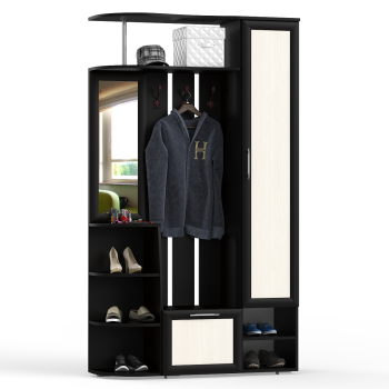 Прихожая Ксения-2. Размер прихожей (ШхГхВ) 120х38х216 см. Прихожая состоит из шкафа-пенала, открытой вешалки, открытого стеллажа, тумбы для обуви и зеркальной панели – компактное решение с большим функциональным ресурсом